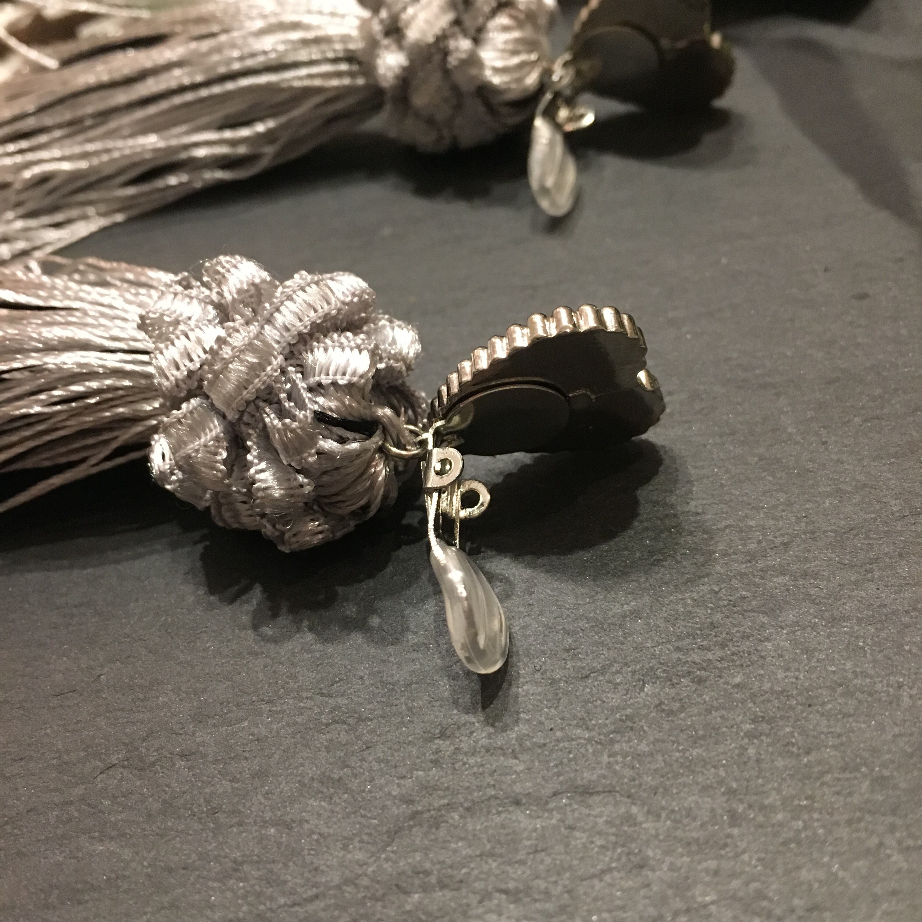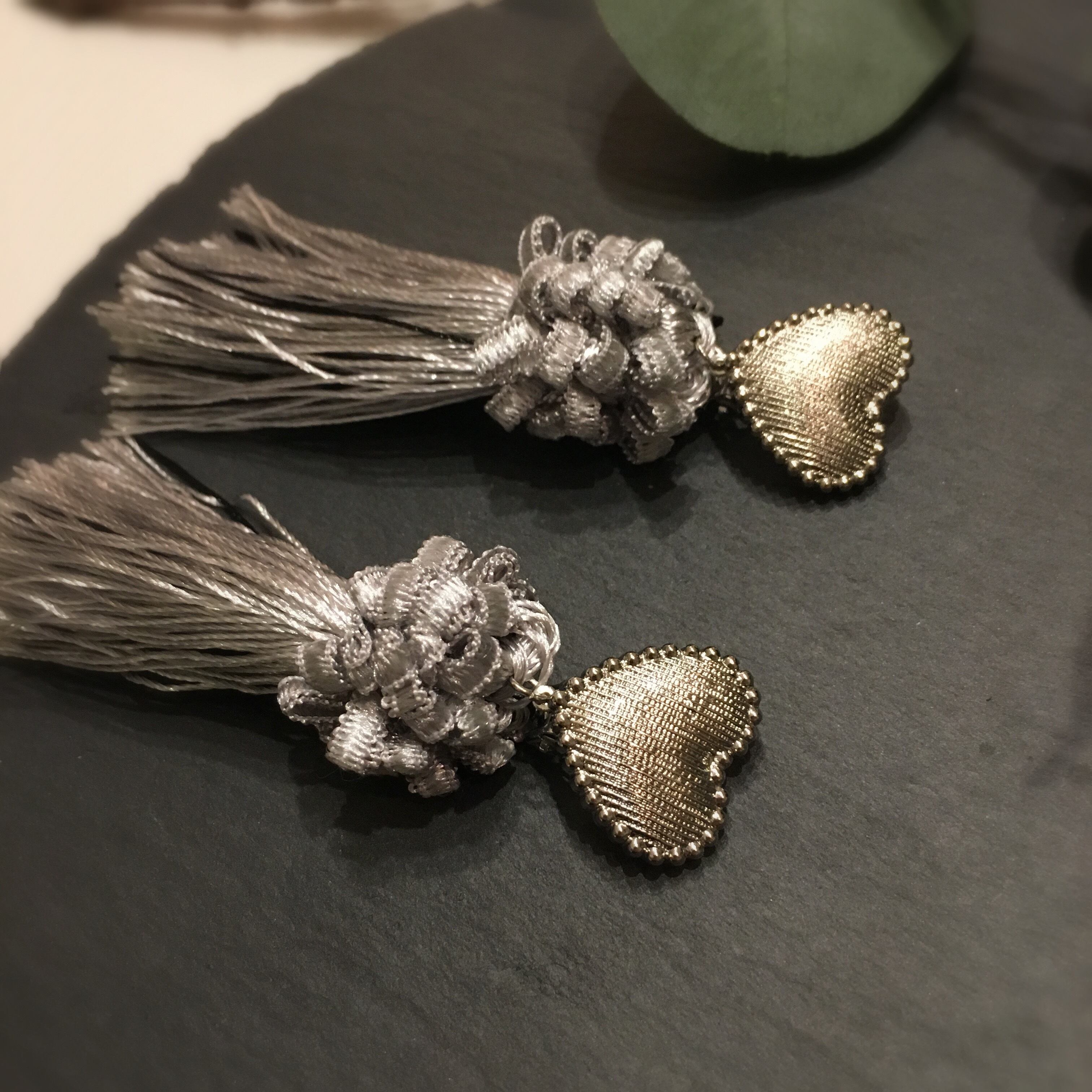 大振りなデザインタッセルが目を引くアイテムです。ハートデザインでもシルバー調なので、甘くなりすぎず着用して頂けます。