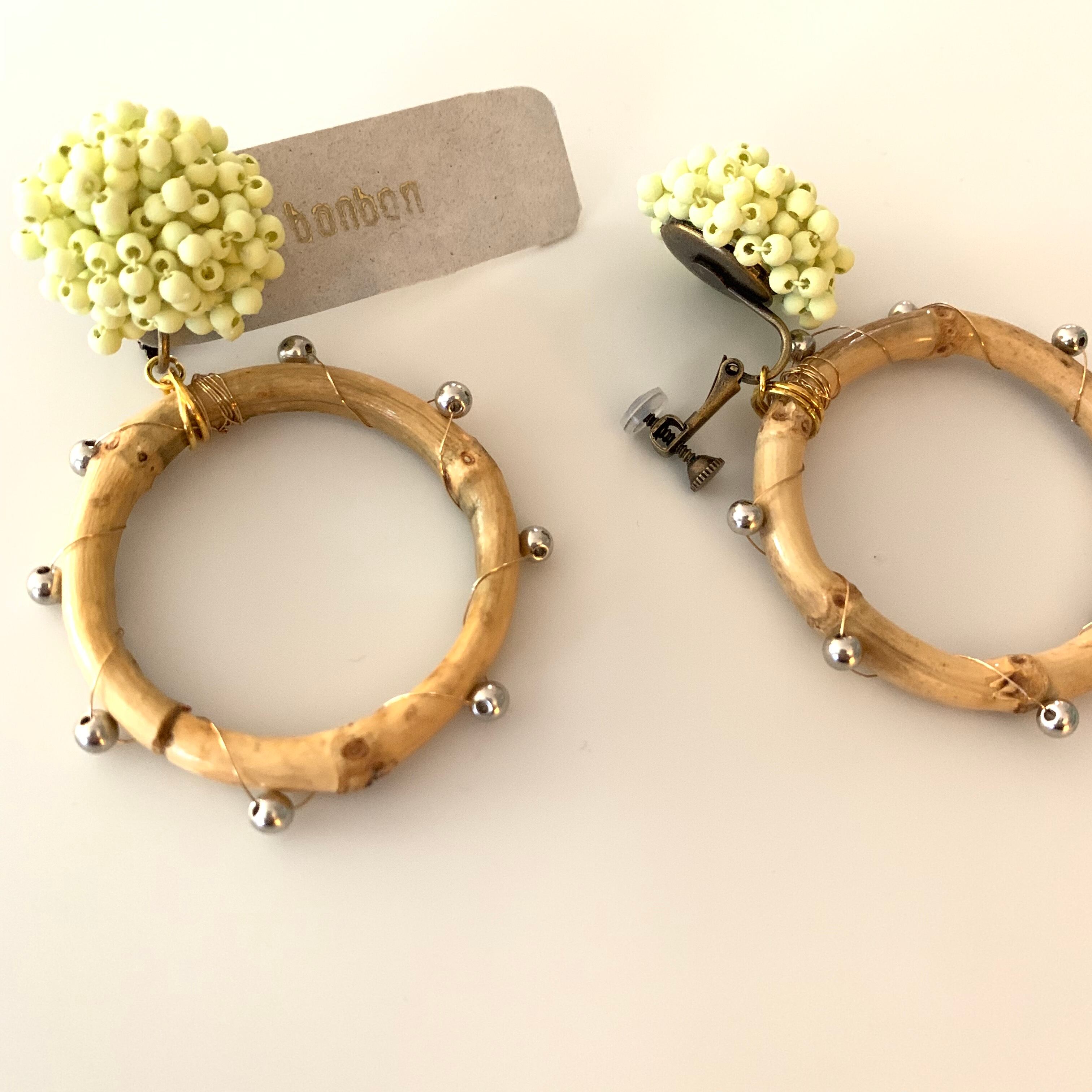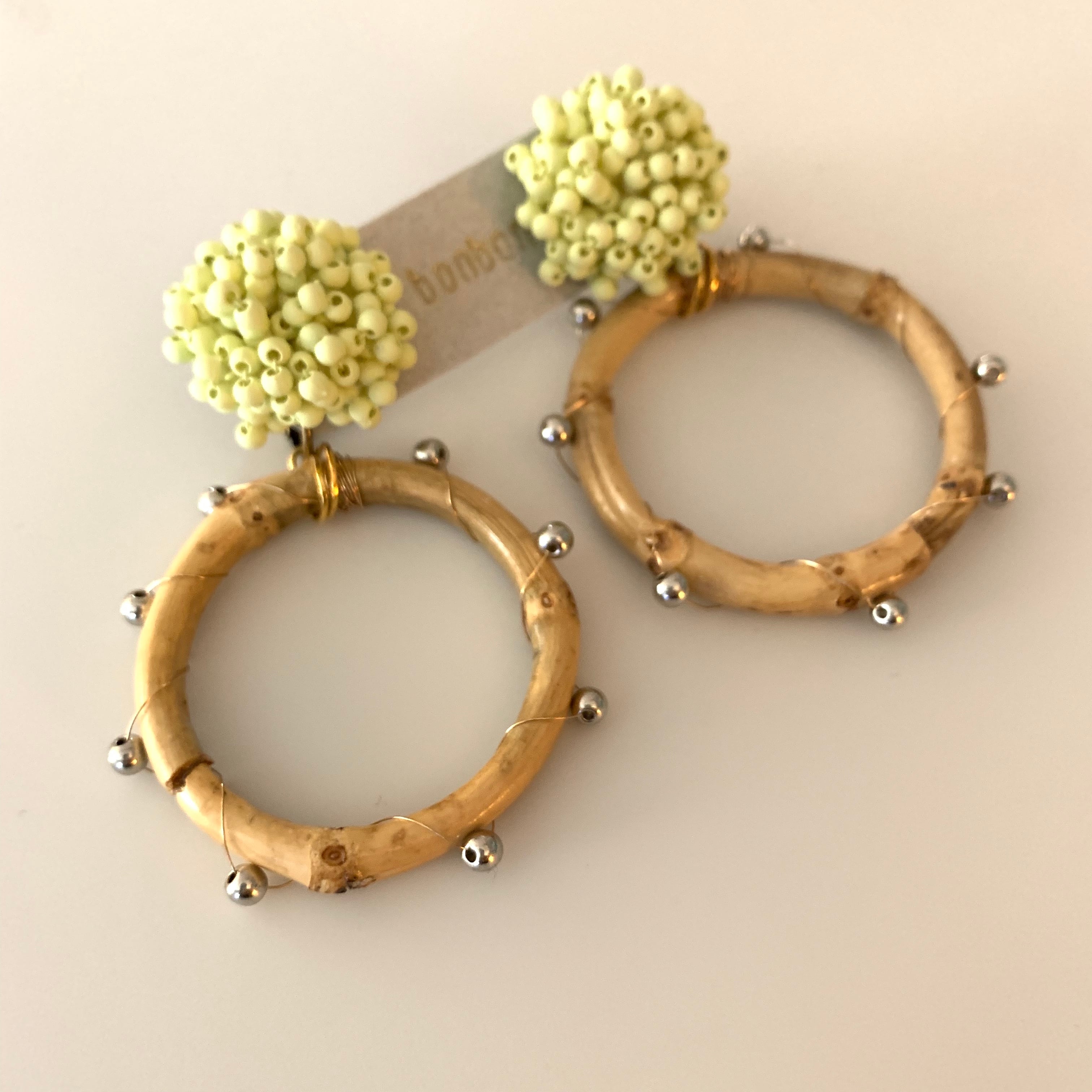 イエローのカラービーズにメタルを編み込んだバンブーの組み合わせです。 size 縦約7㎝ 横約4.5㎝ ※handmade ですので左右の個体差があります。 ご理解頂ける方のみ、ご購入下さいませ。 ♦︎ご購入にあたっては必ずSHOP情報をご覧下さい。