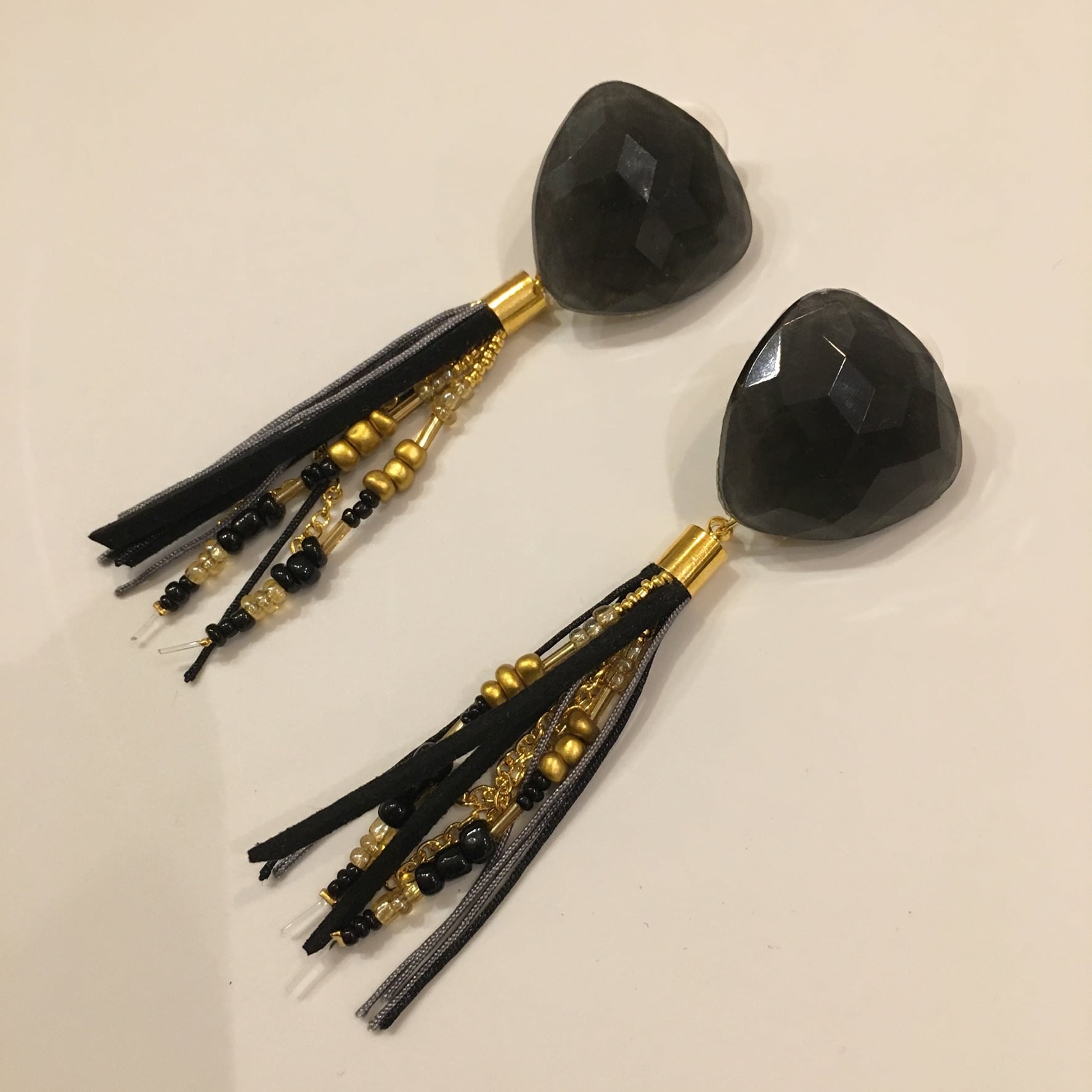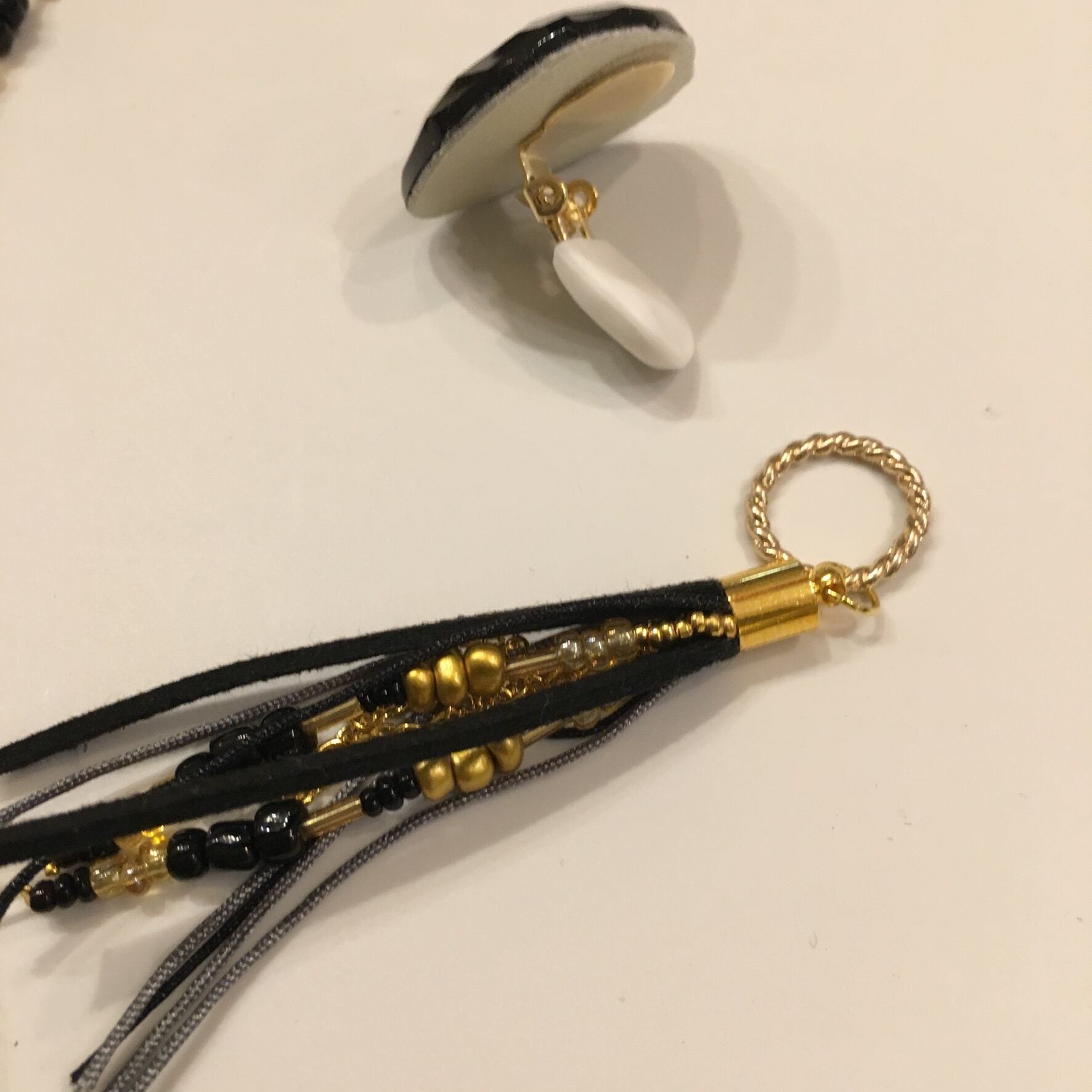 ドイツのヴィンテージカボションを使ったイヤリングです。 size カボション部分 縦横約3㎝ タッセル 約7㎝ ※handmade ですので左右の個体差があります。 ご理解頂ける方のみ、ご購入下さいませ。 ♦︎ご購入にあたっては必ずSHOP情報をご覧下さい。