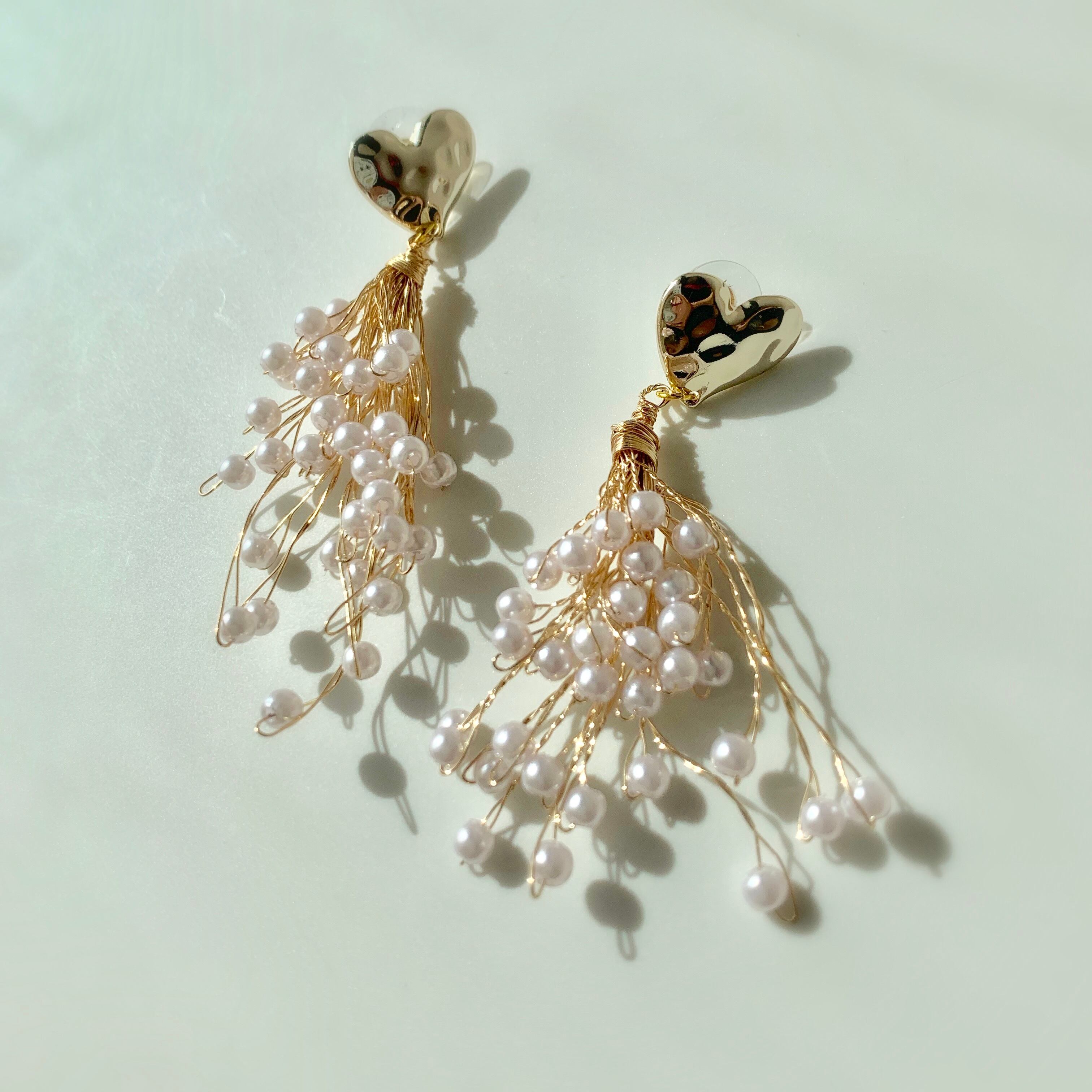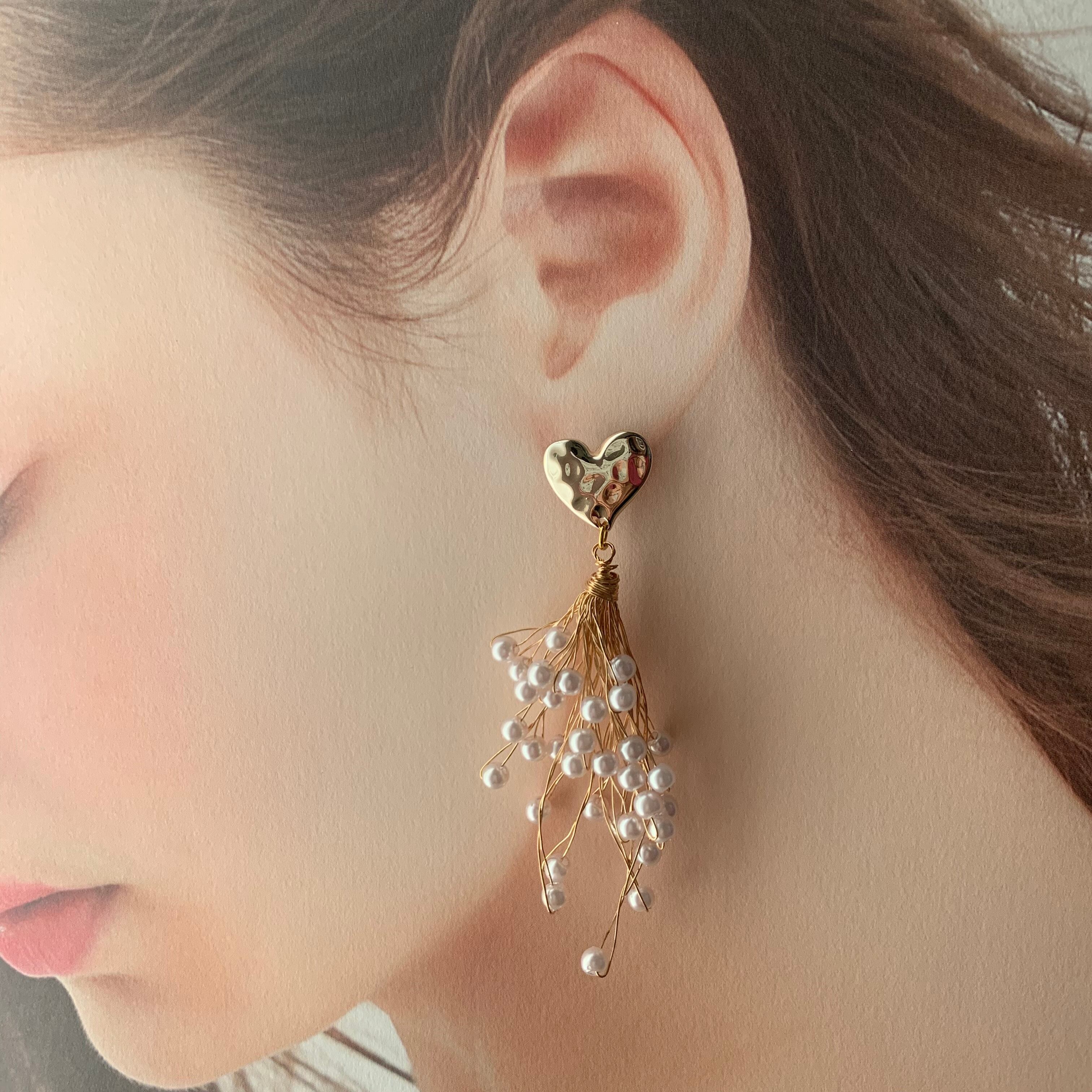 一粒づつパールビーズを通したワイヤーチャームが可愛いハートピアスです。 サイズ 縦約7㎝ 横4㎝ ※handmade ですので左右の個体差があります。 ご理解頂ける方のみ、ご購入下さいませ。 ご購入の際はshop情報を必ずご覧下さいませ。