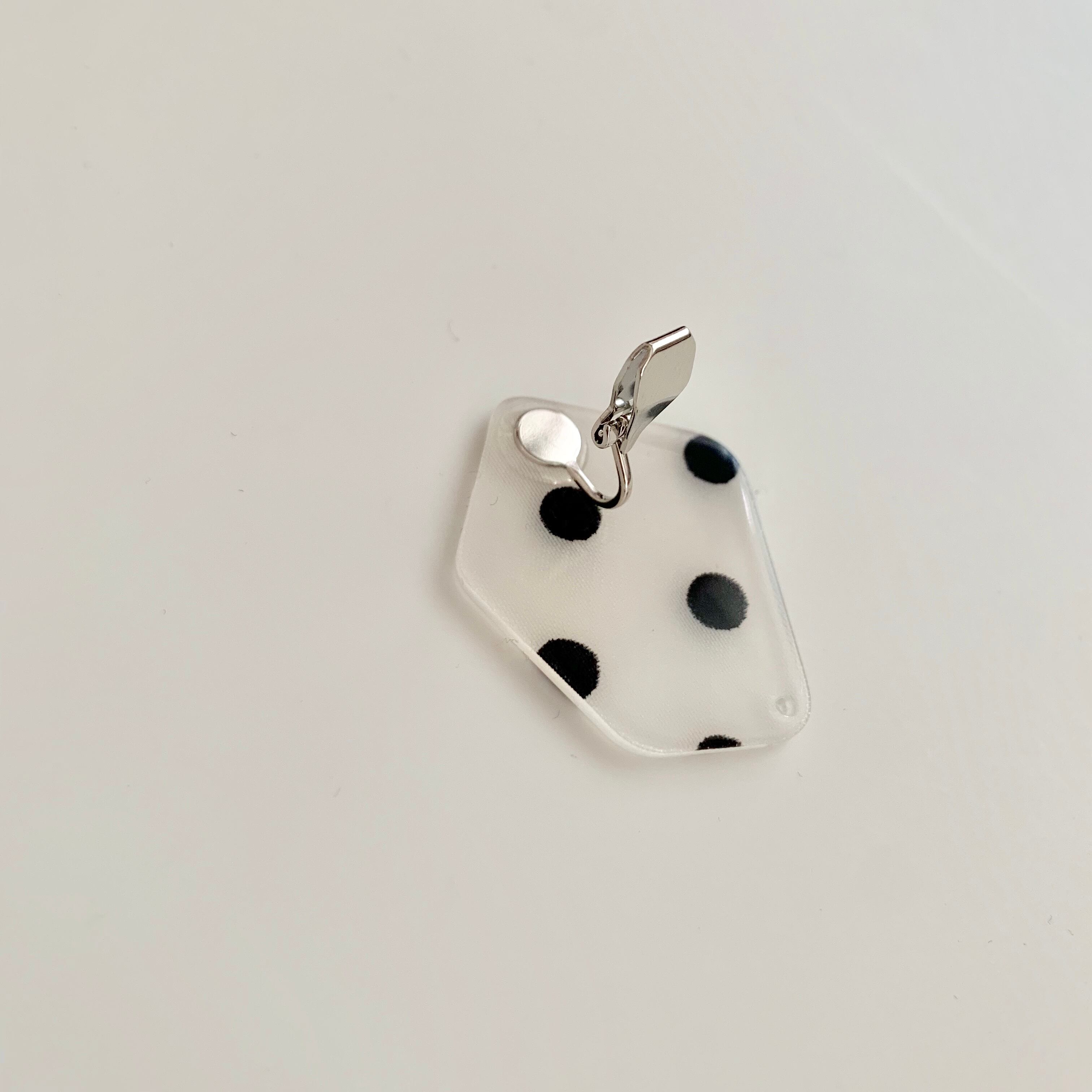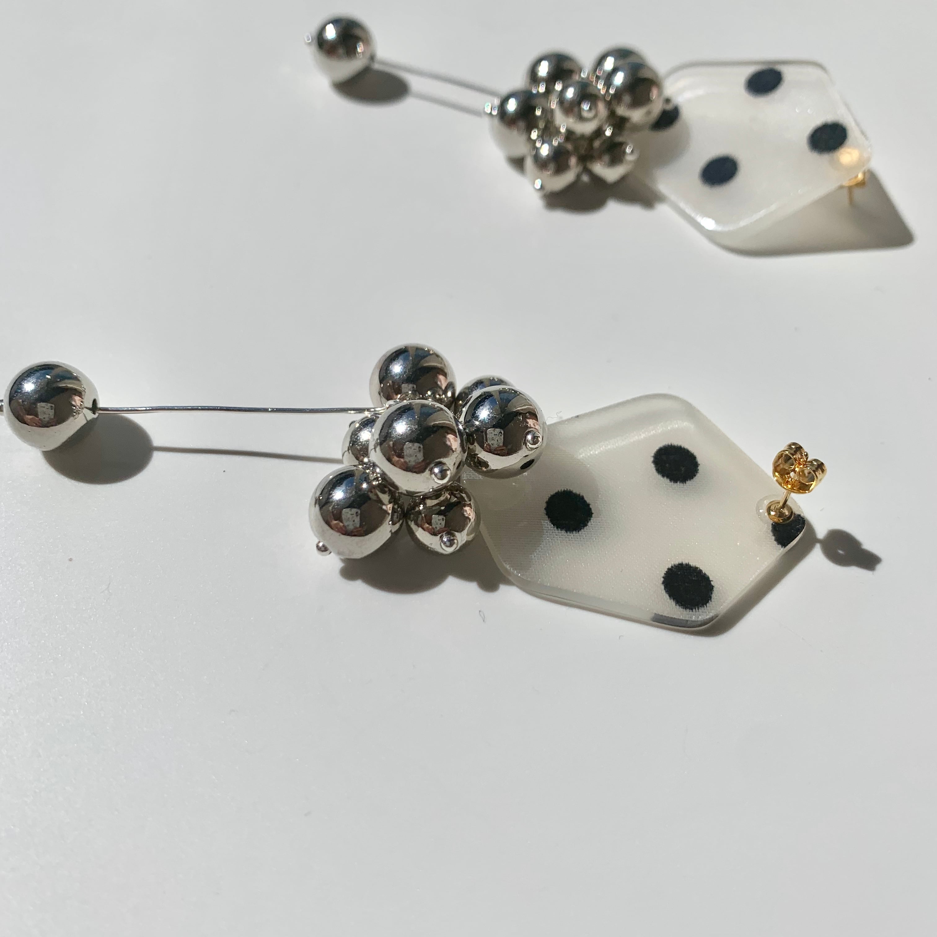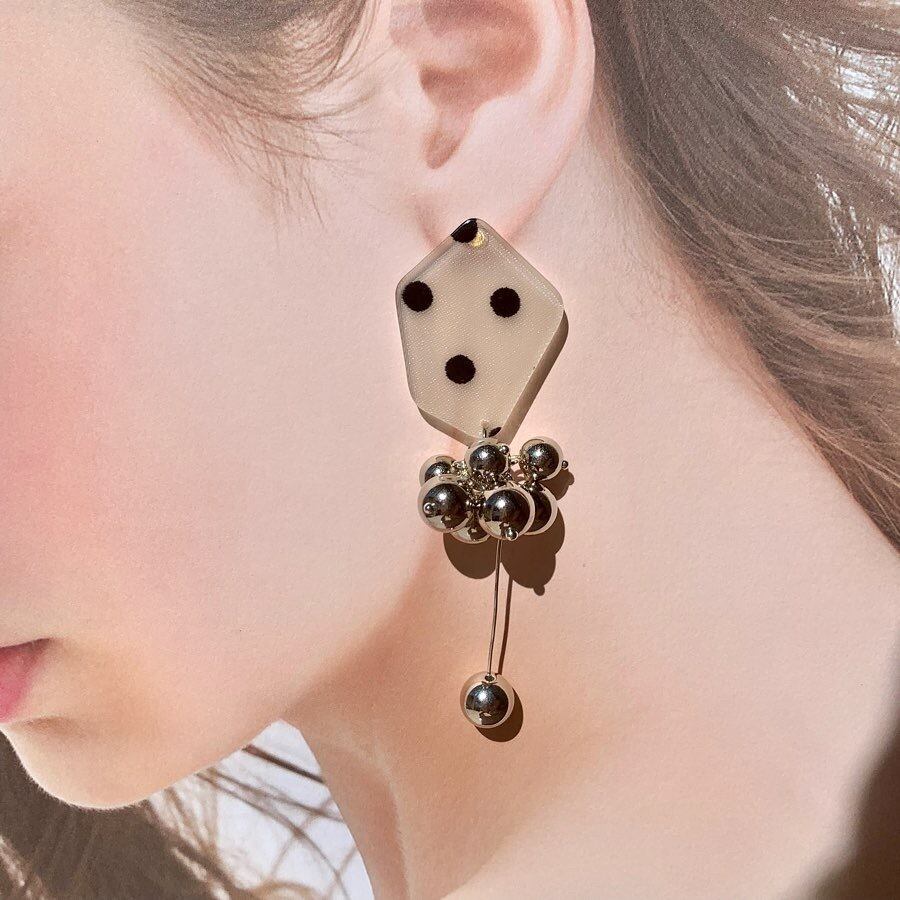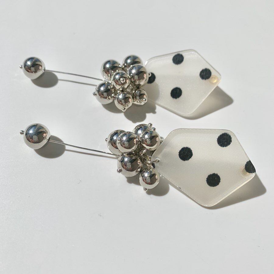 可愛いドット柄のパーツにシルバーボールを組み合わせました♪シンプルなコーディネートのワンポイントに◎ size 横約3.7㎝ 縦約8㎝ *イヤリングについては接着面との強化の為、少し大きめの金具にさせて頂いております。写真よりご確認下さいませ。 ※こちらhandmadeの商品になりますので左右の個体差があります。ご購入の際はshop情報を必ずご覧下さいませ。
