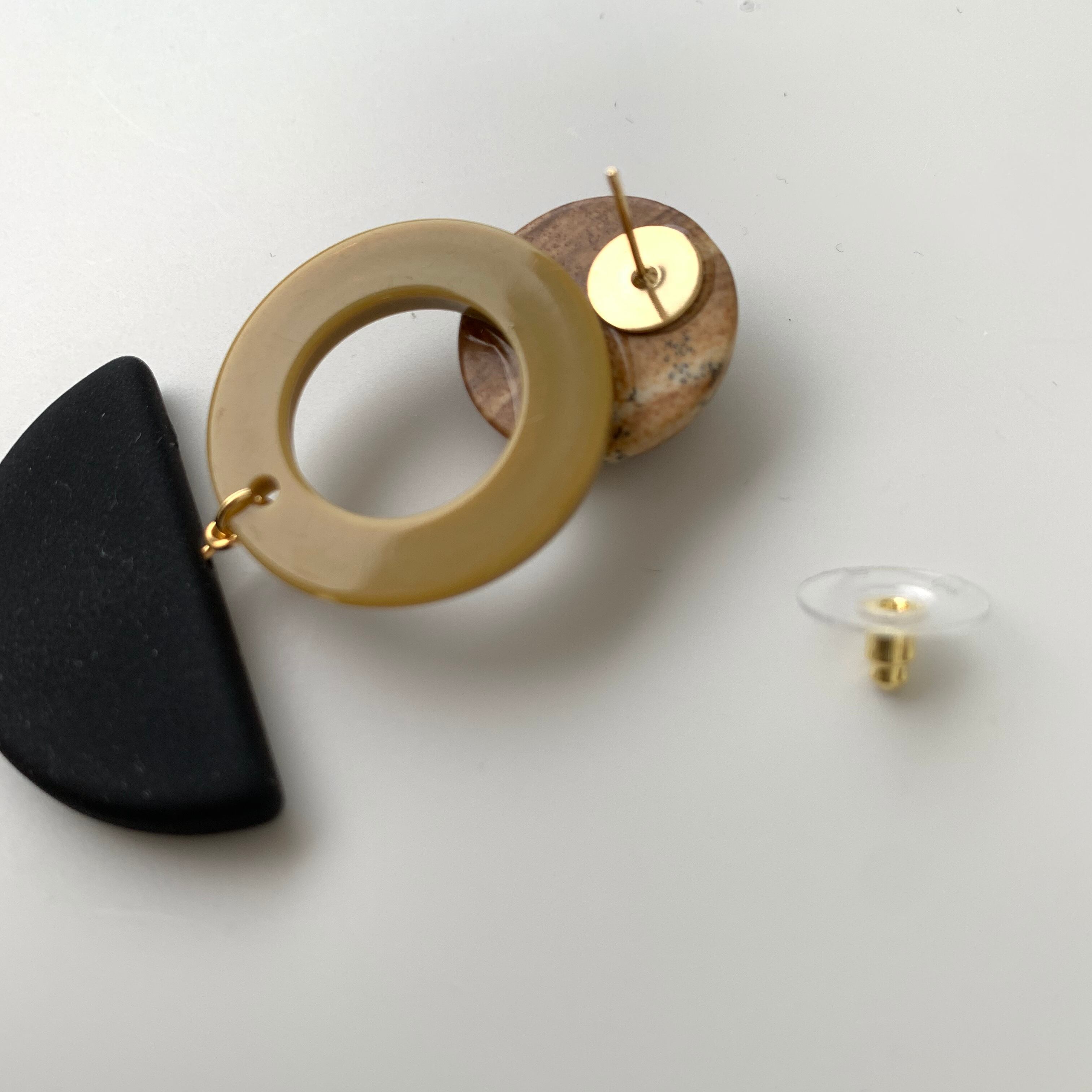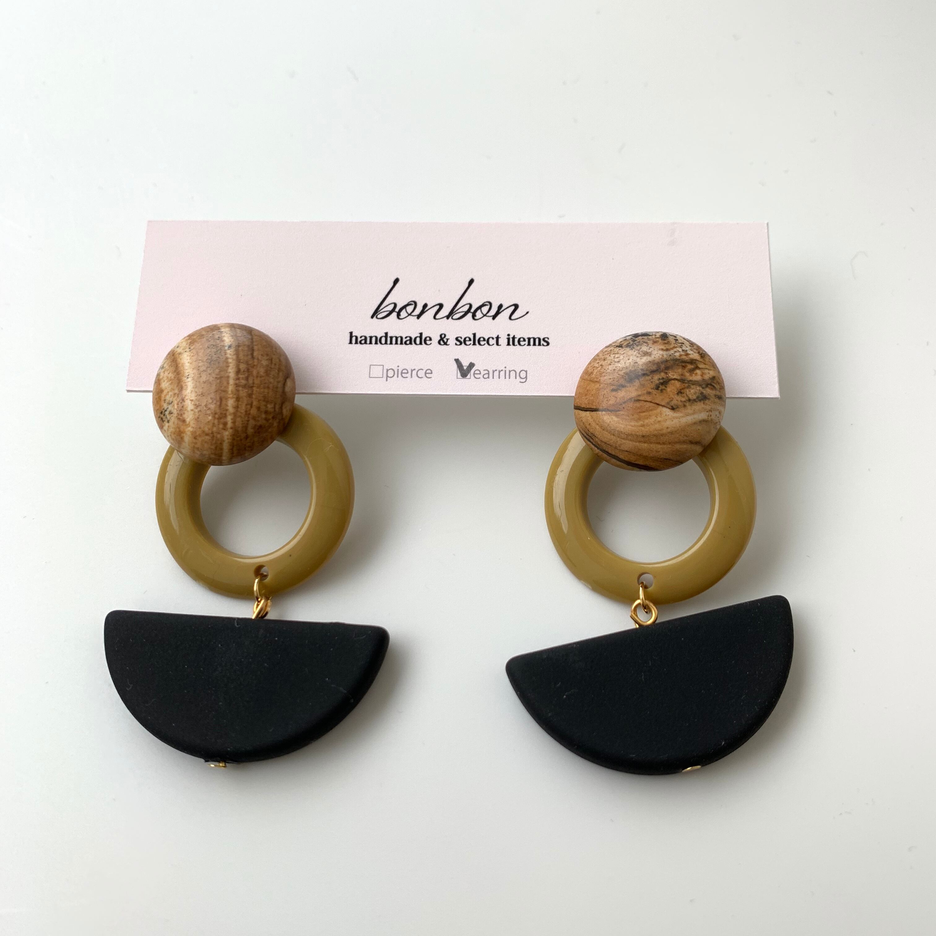 ナチュラルなウッドの質感とくすみカラーが可愛いいピアスです♪ size 縦約5㎝ 横約2㎝ ※こちらはhandmadeの商品になります。ご購入の際は必ずSHOP情報をご覧下さいませ。