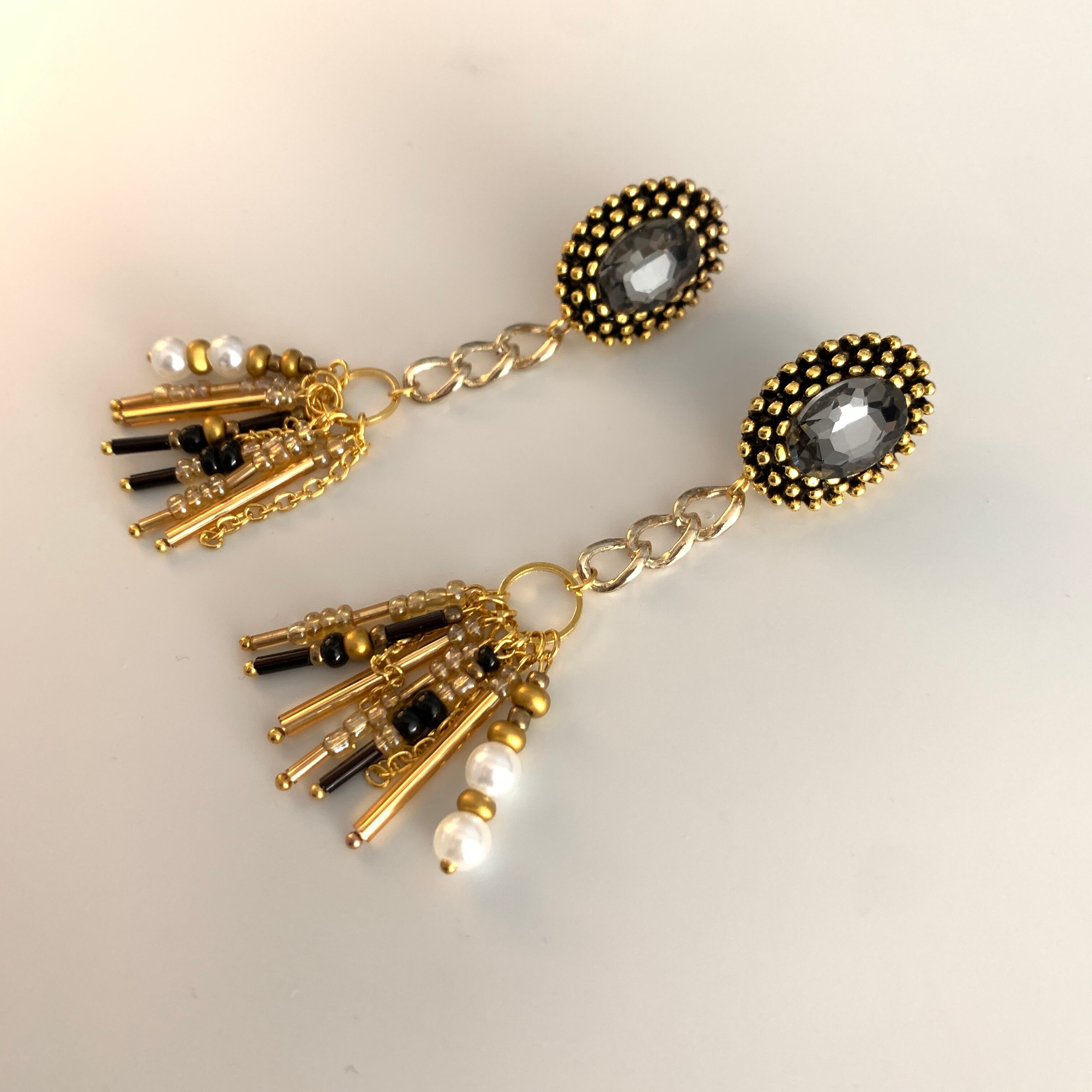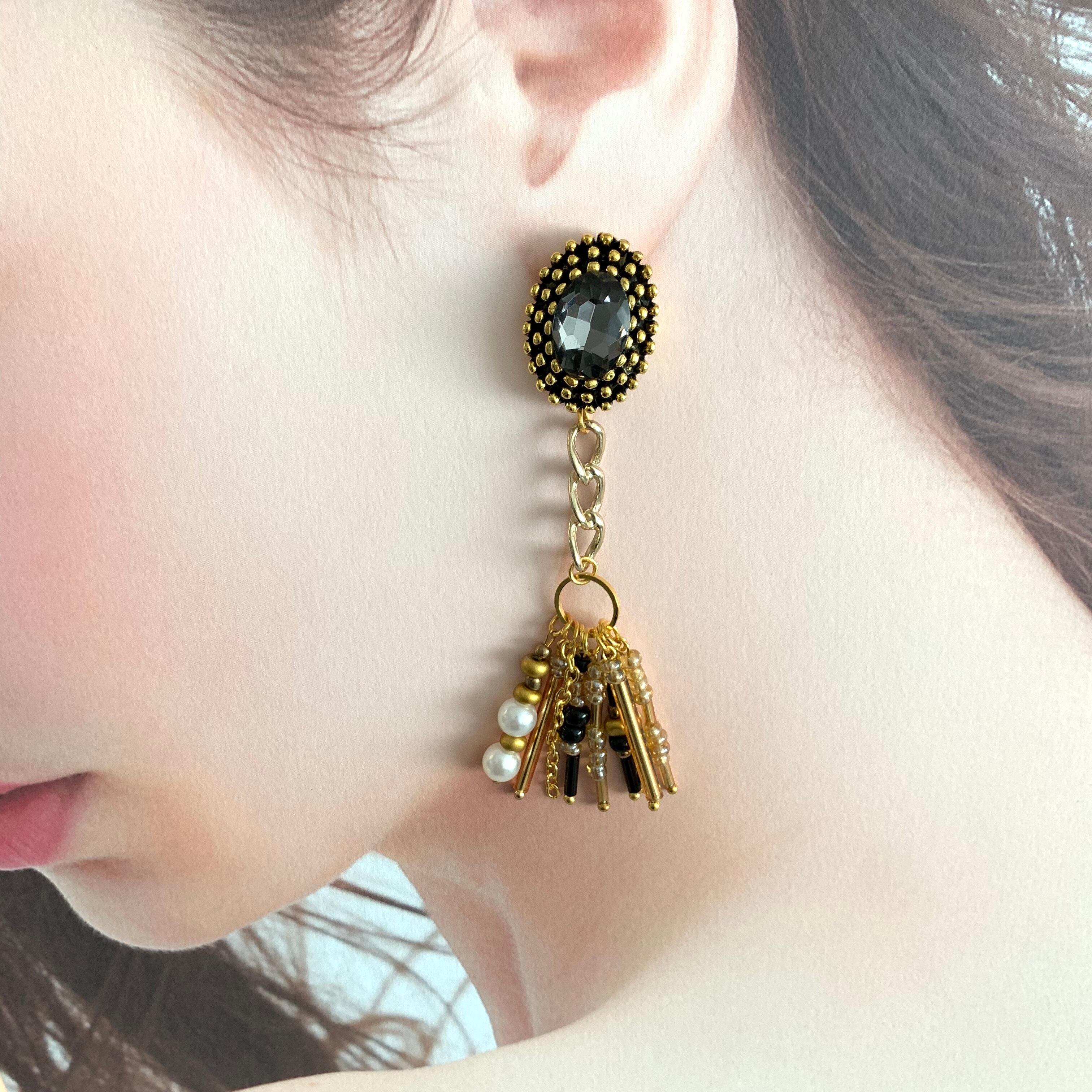 色々なビーズをミックスさせチャームに。 揺れ動くデザインなので耳元を華やかにしてくれます♪ size 縦約9㎝ 横約2㎝ ※こちらはhandmadeの商品になりますので