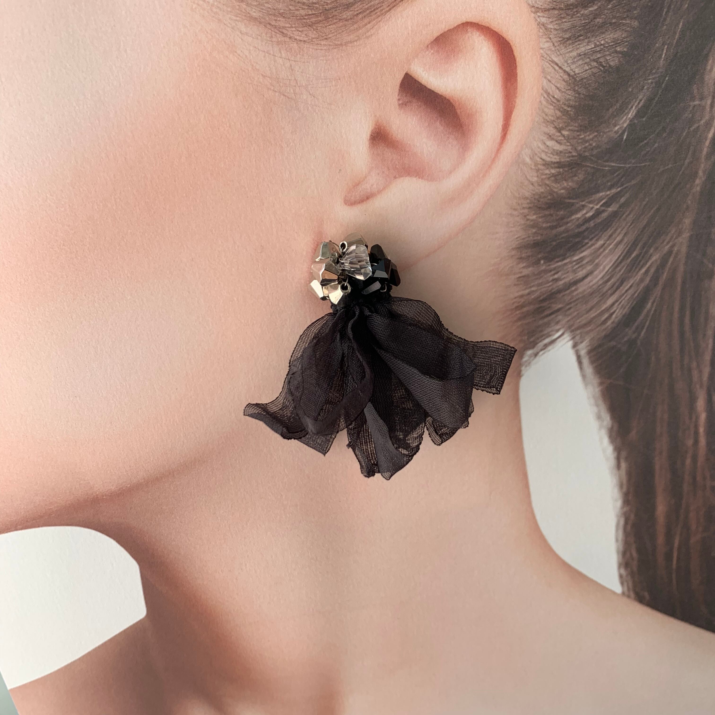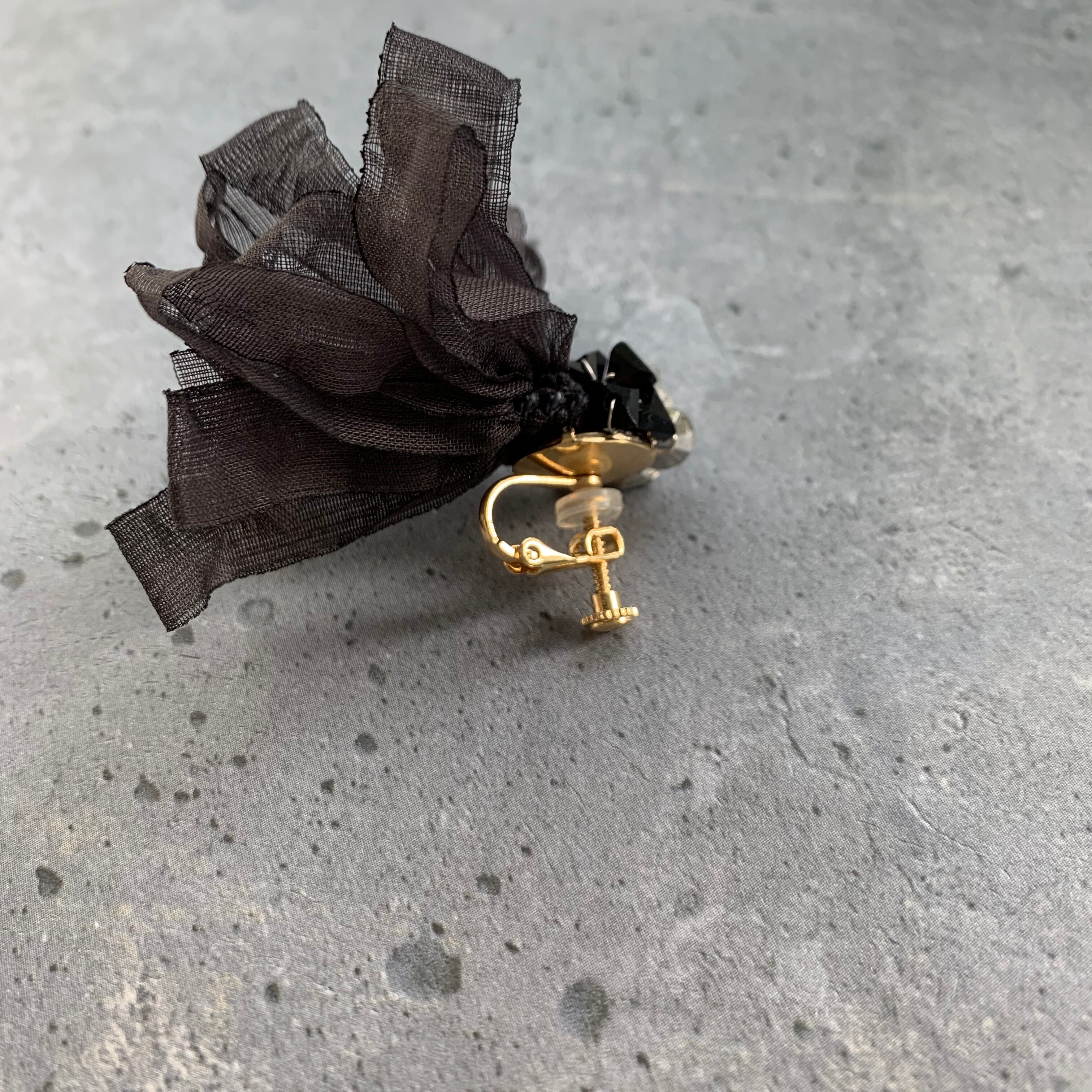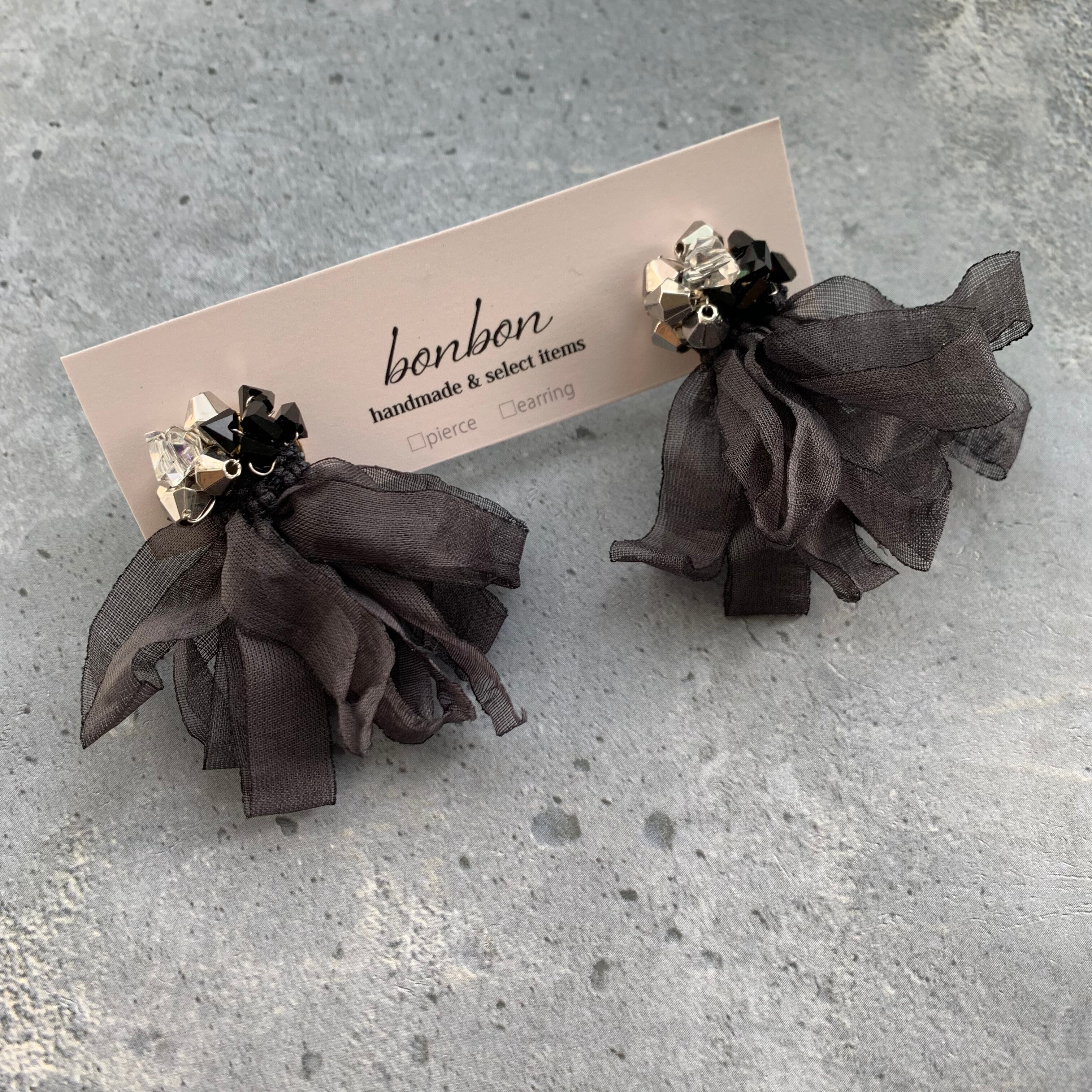 ビーズとリボンを掛け合わせ製作致しました♪ ブラックカラーのリボンなので可愛くなりすぎずにコーディネートして頂けます。 size 横約5㎝ 縦約5㎝ ※こちらはhandmadeの商品になりますので左右の個体差があります。ご了承の上お買い求め下さい。尚、ご購入の際は必ずSHOP情報をご覧下さいませ。