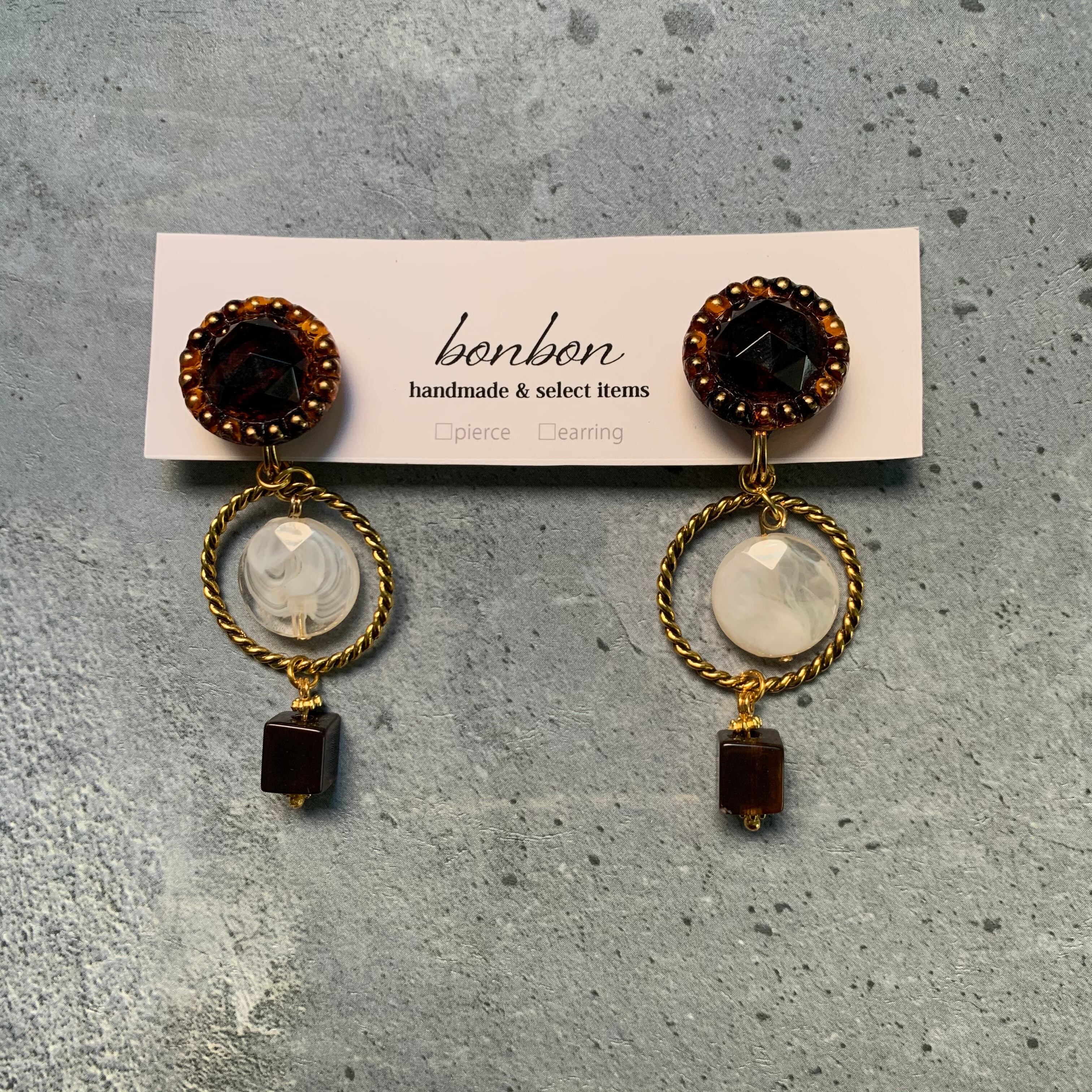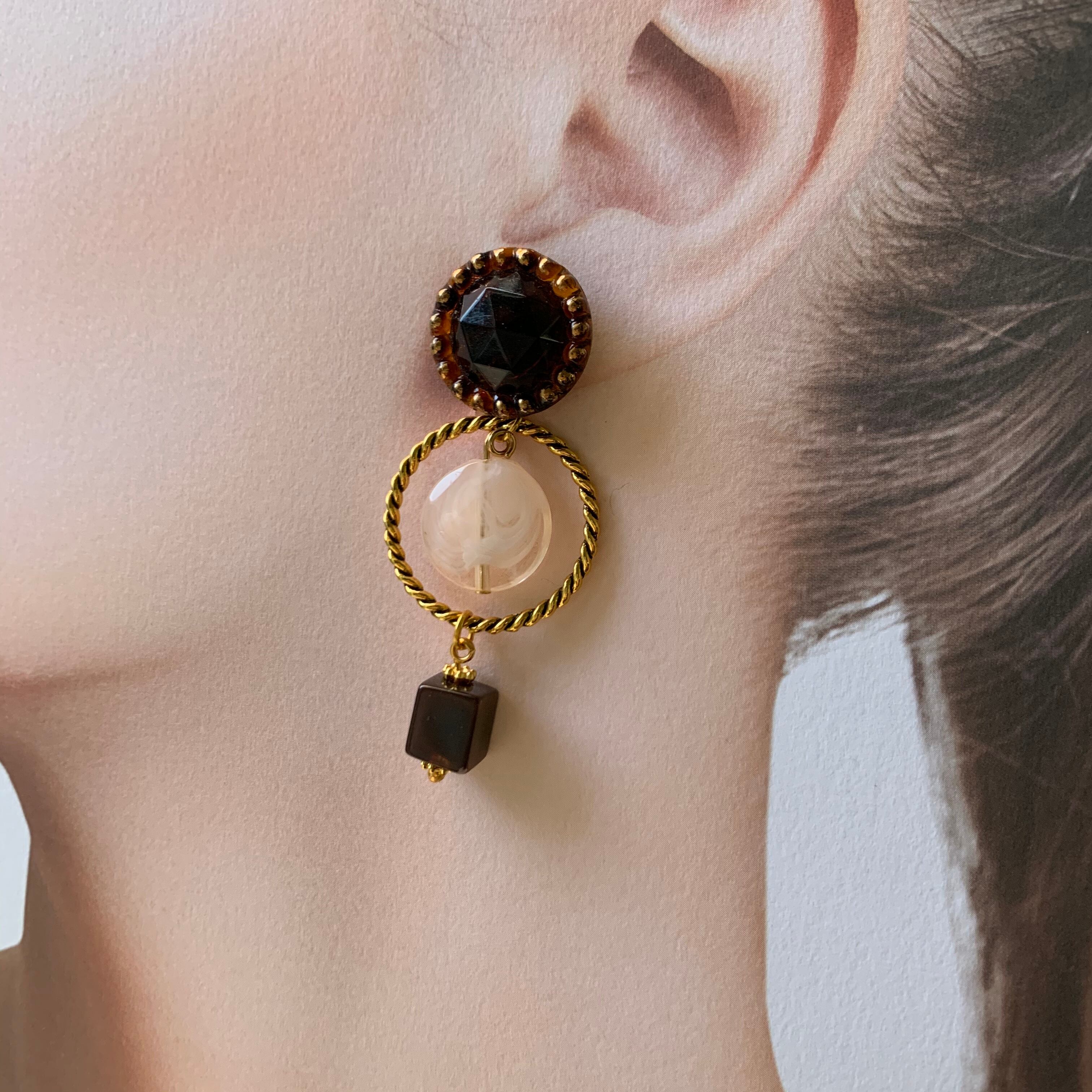 ヴィンテージボタンを加工し製作致しました イヤリングのみの対応となります size 横約1.8㎝ 縦約7㎝ ※こちらはhandmadeの商品ですので左右の 個体差があります ご理解の上でご購入をお願い致します なお、ご購入の際はショップ情報を必ず ご覧くださいませ
