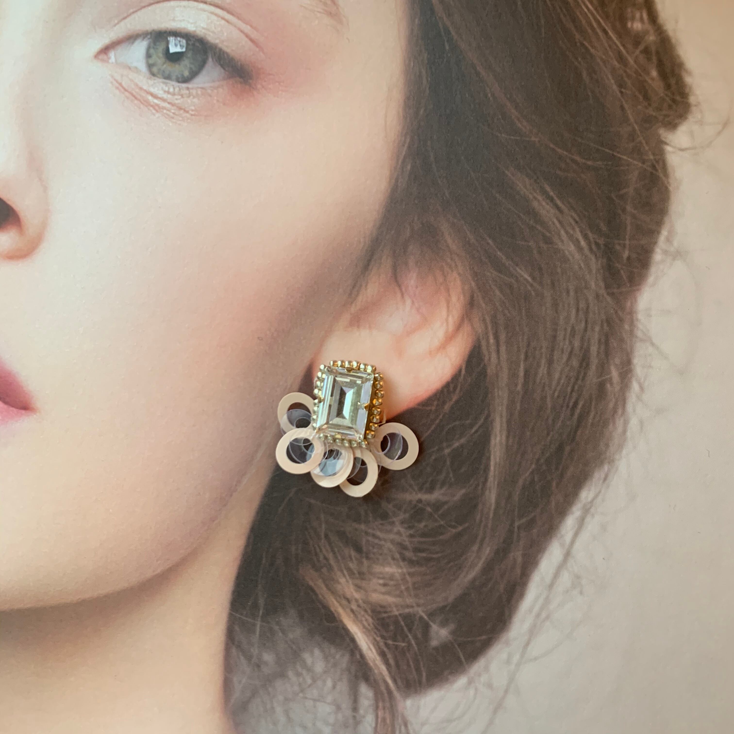 イヤリングは日本製の耳が痛くなりにくい シリコンカバー付きのクリップ式イヤリングを使用しています耳たぶを挟むクリップの角度が調節できます
