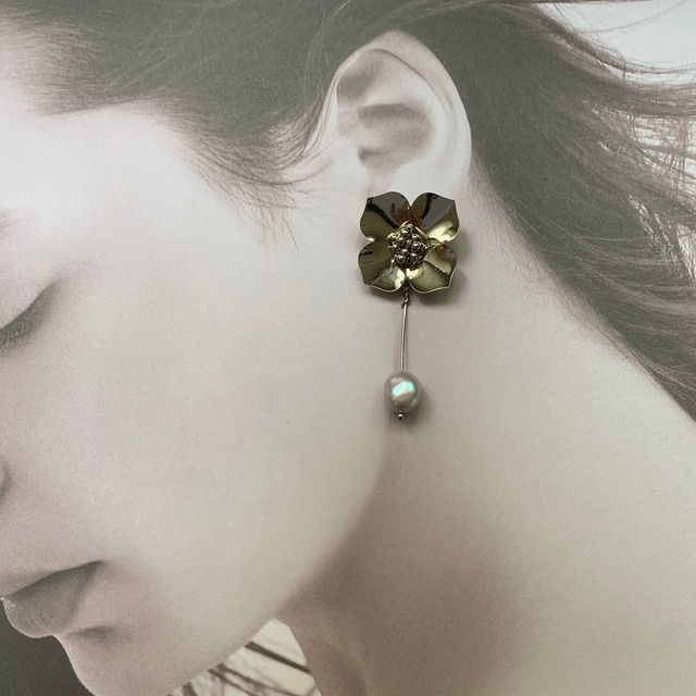 ビーズと淡水パールで仕上げたお花のデザインピアス、イヤリングです