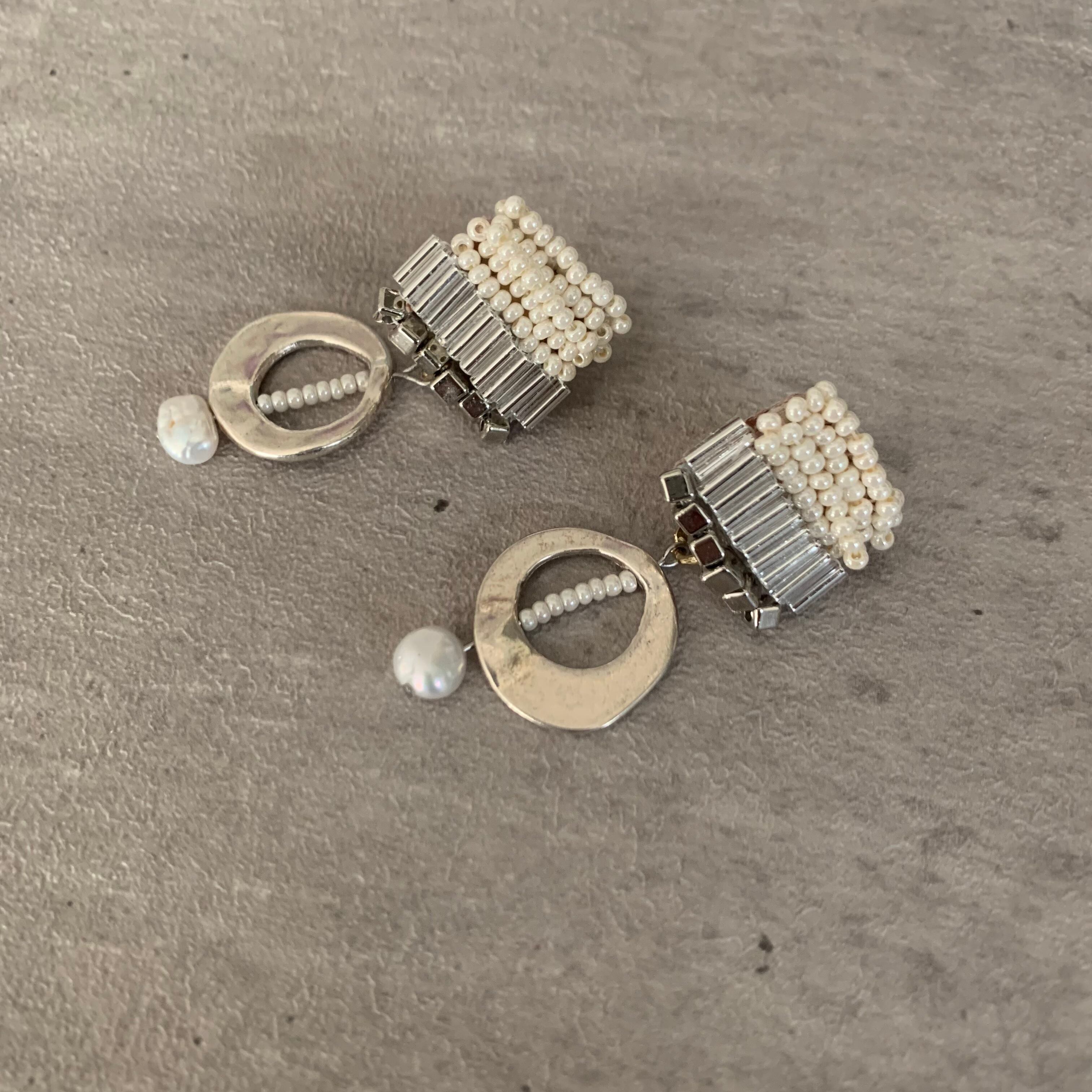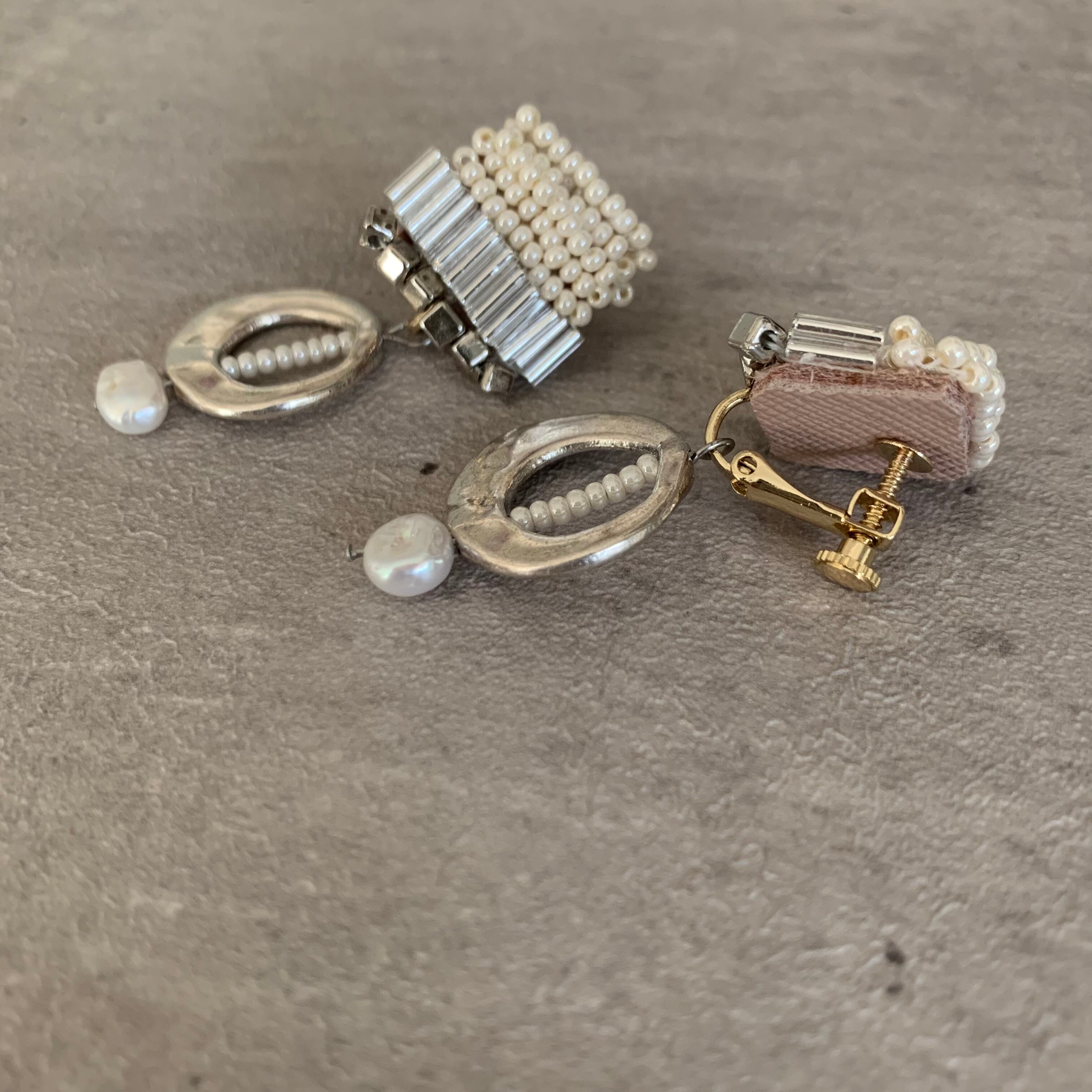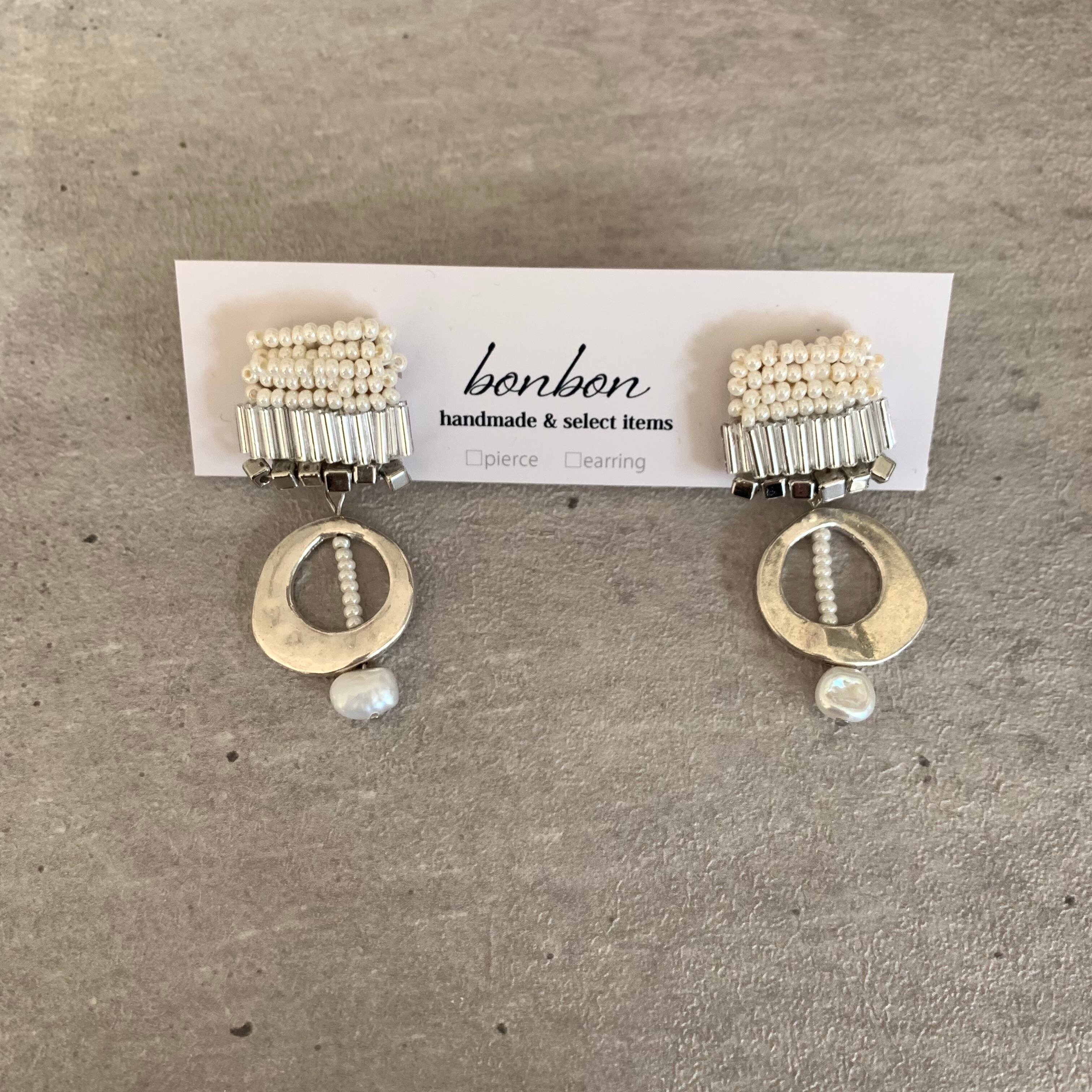 ビーズと淡水パールを一粒使用した揺れるチャームが可愛いデザインイヤリングです。